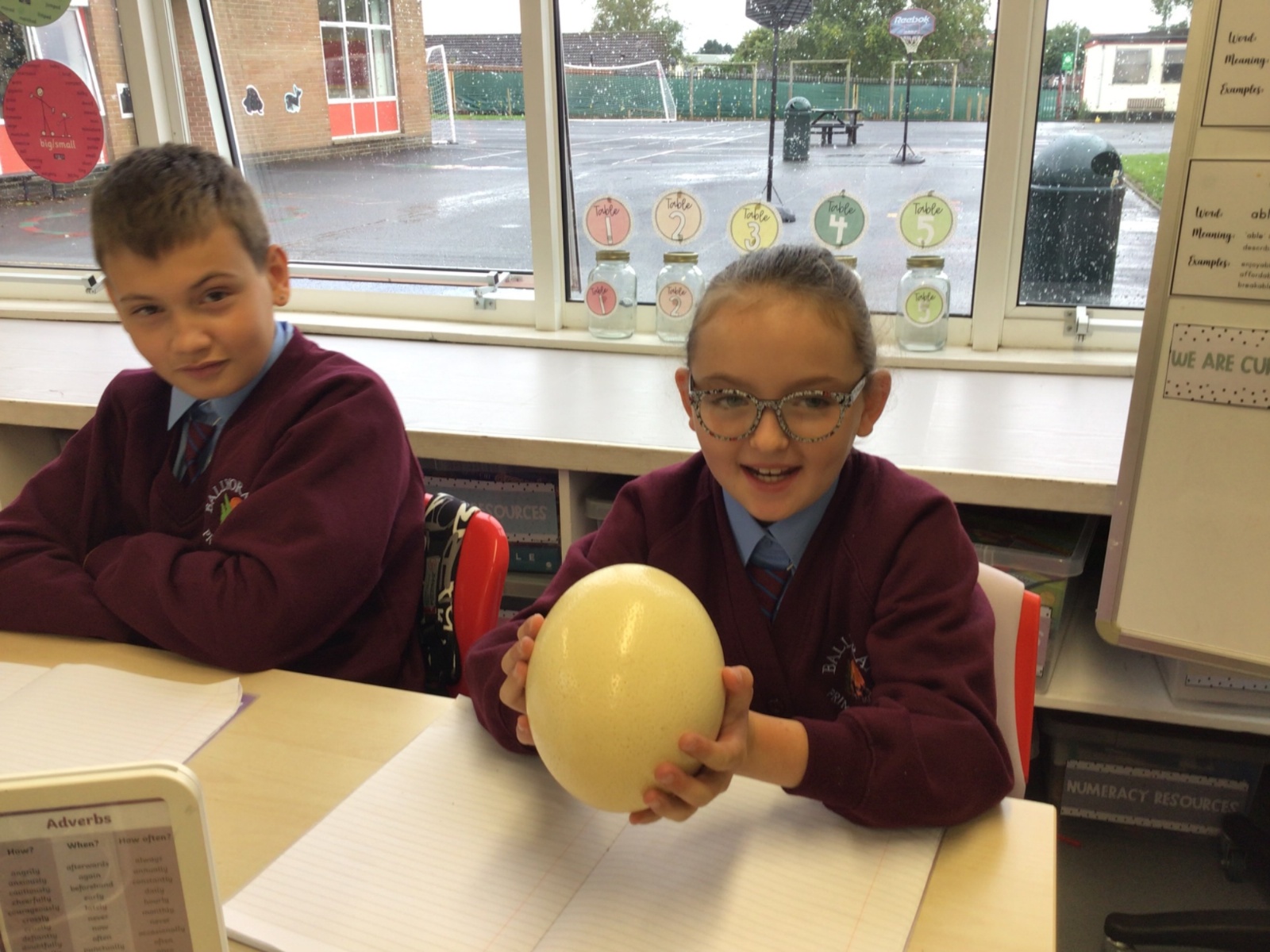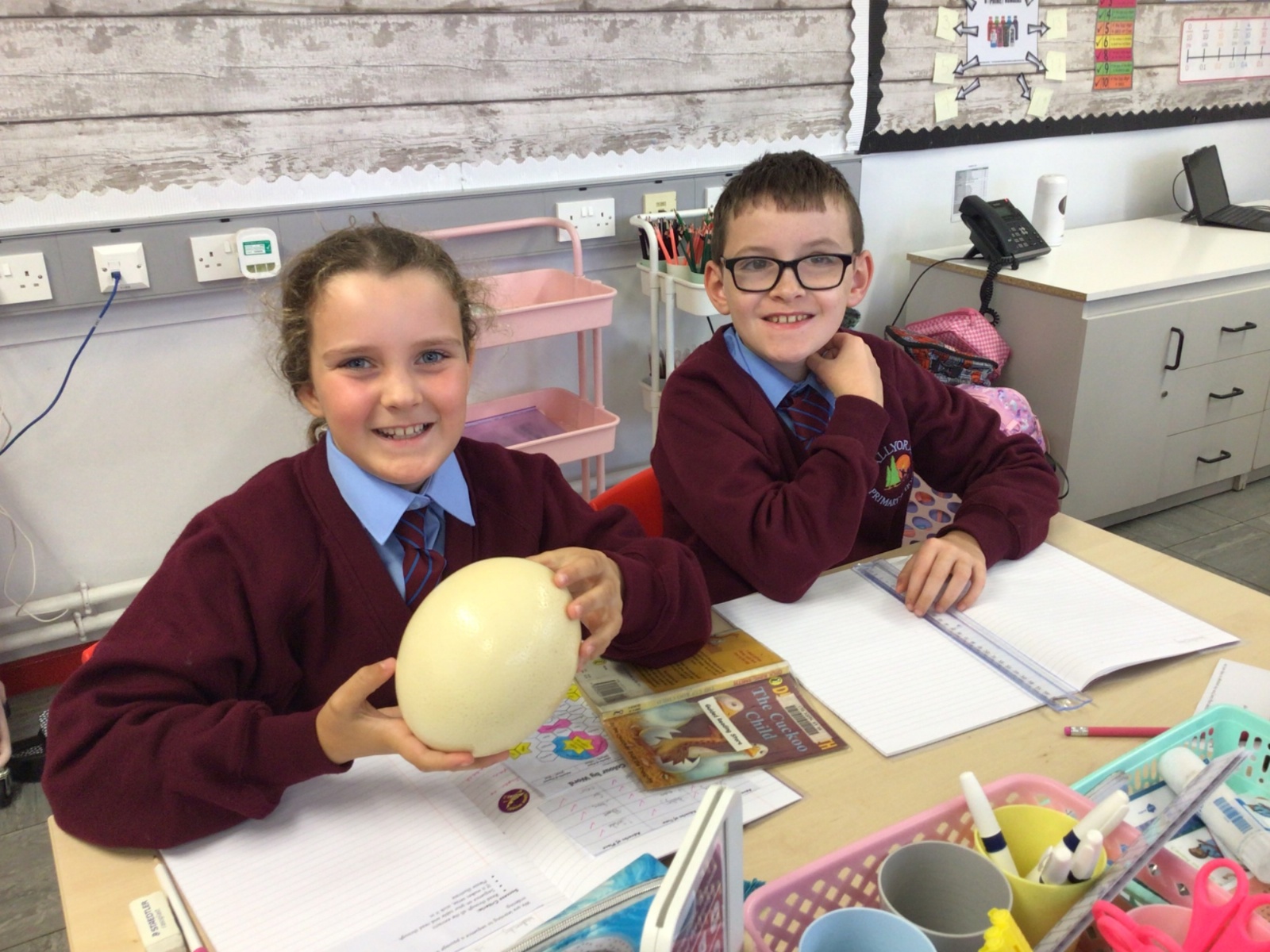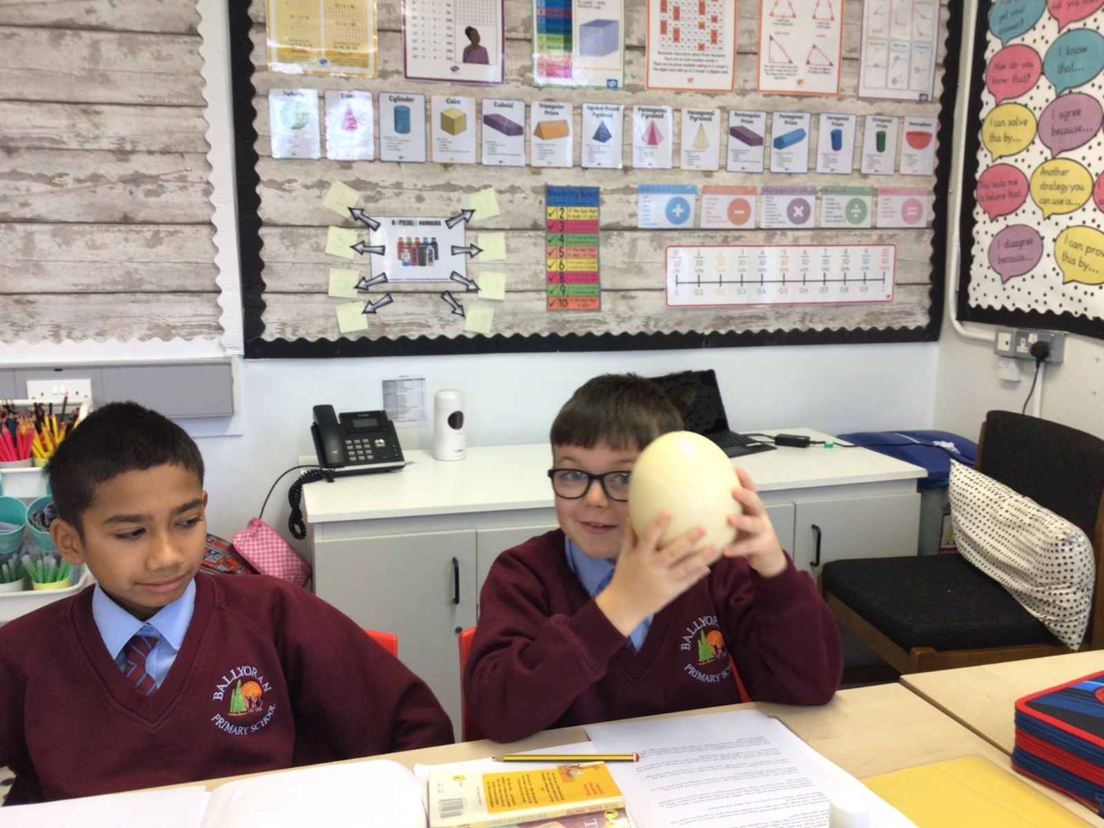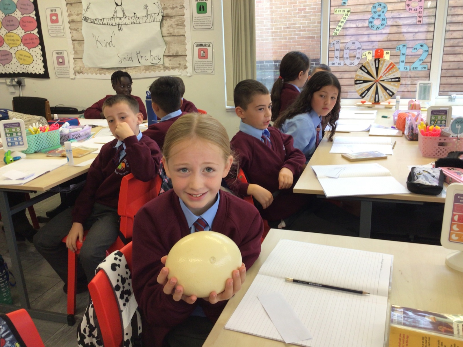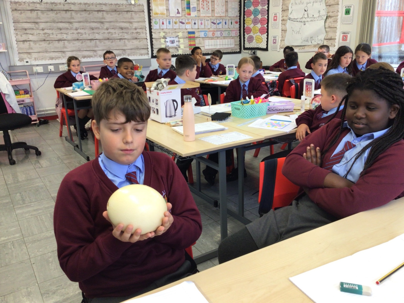 Our class novel is The Cuckoo Child by Dick King-Smith. In the story, Jack Daw steals an ostrich egg from the Wildlife Park to try and hatch it at his farm. We were delighted to see and handle a real ostrich egg today. They are gigantic! The largest egg of any bird 🥚