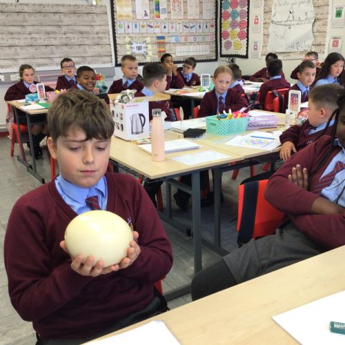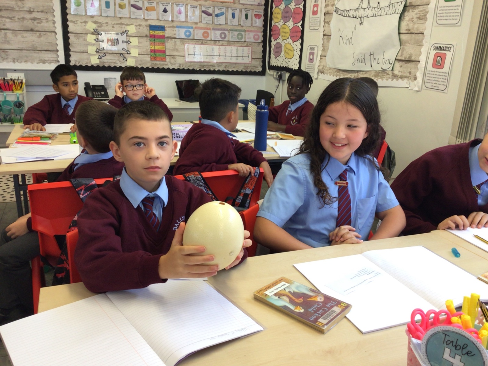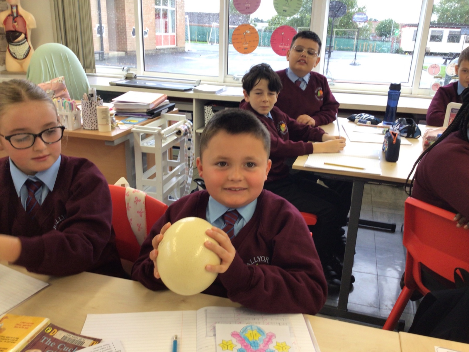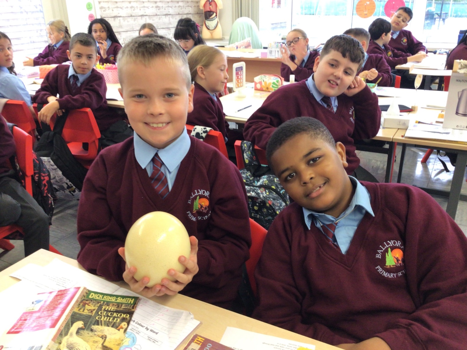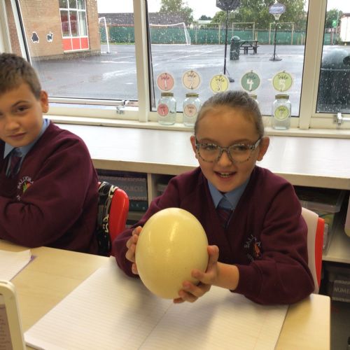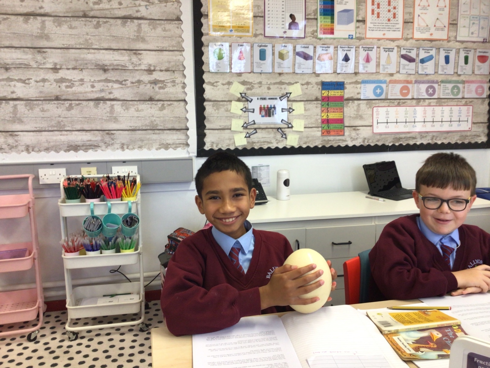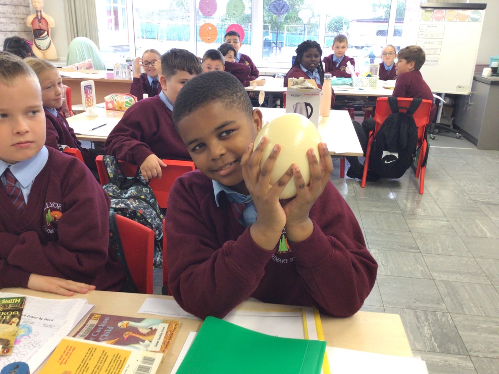 Our class novel is The Cuckoo Child by Dick King-Smith. In the story, Jack Daw steals an ostrich egg from the Wildlife Park to try and hatch it at his farm. We were delighted to see and handle a real ostrich egg today. They are gigantic! The largest egg of any bird 🥚