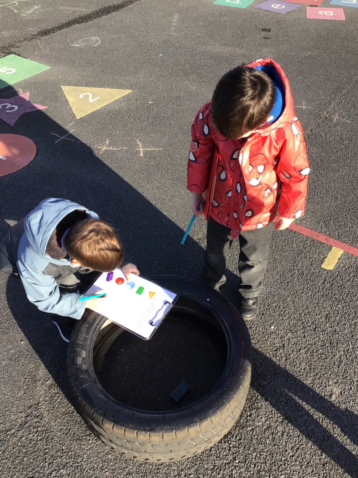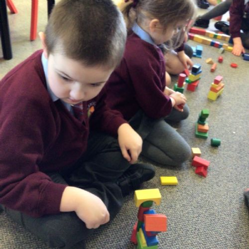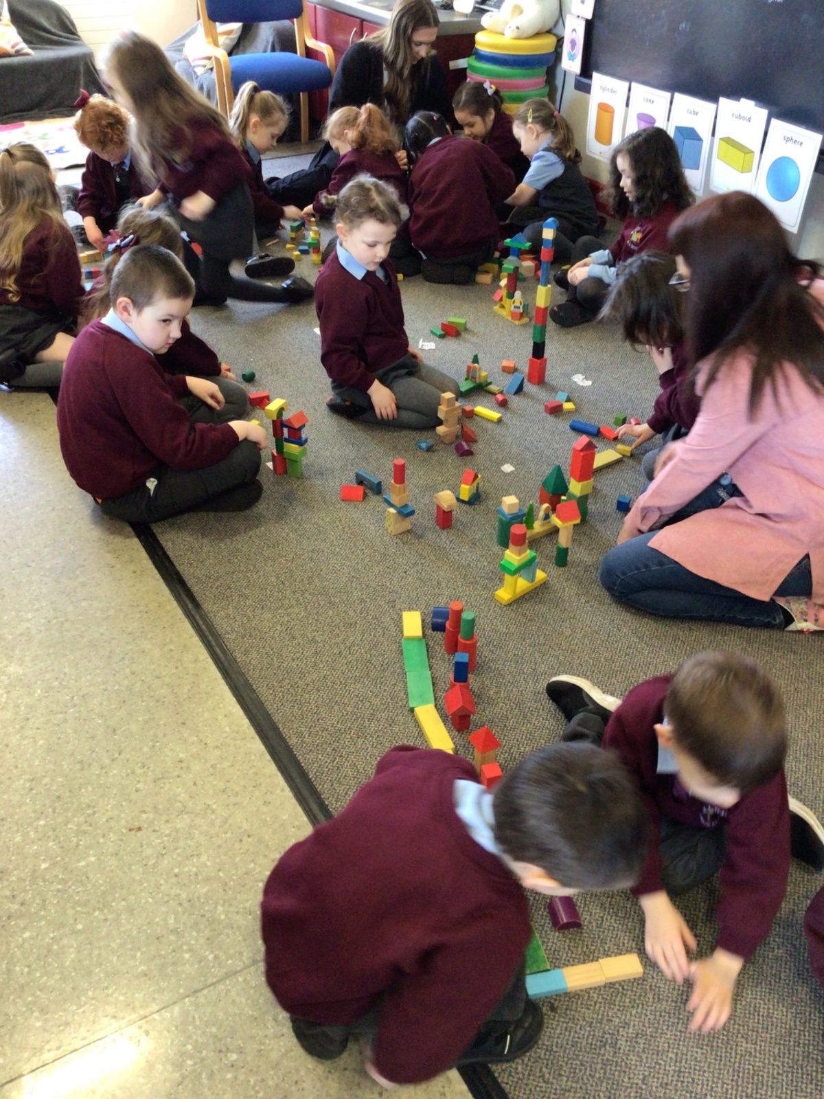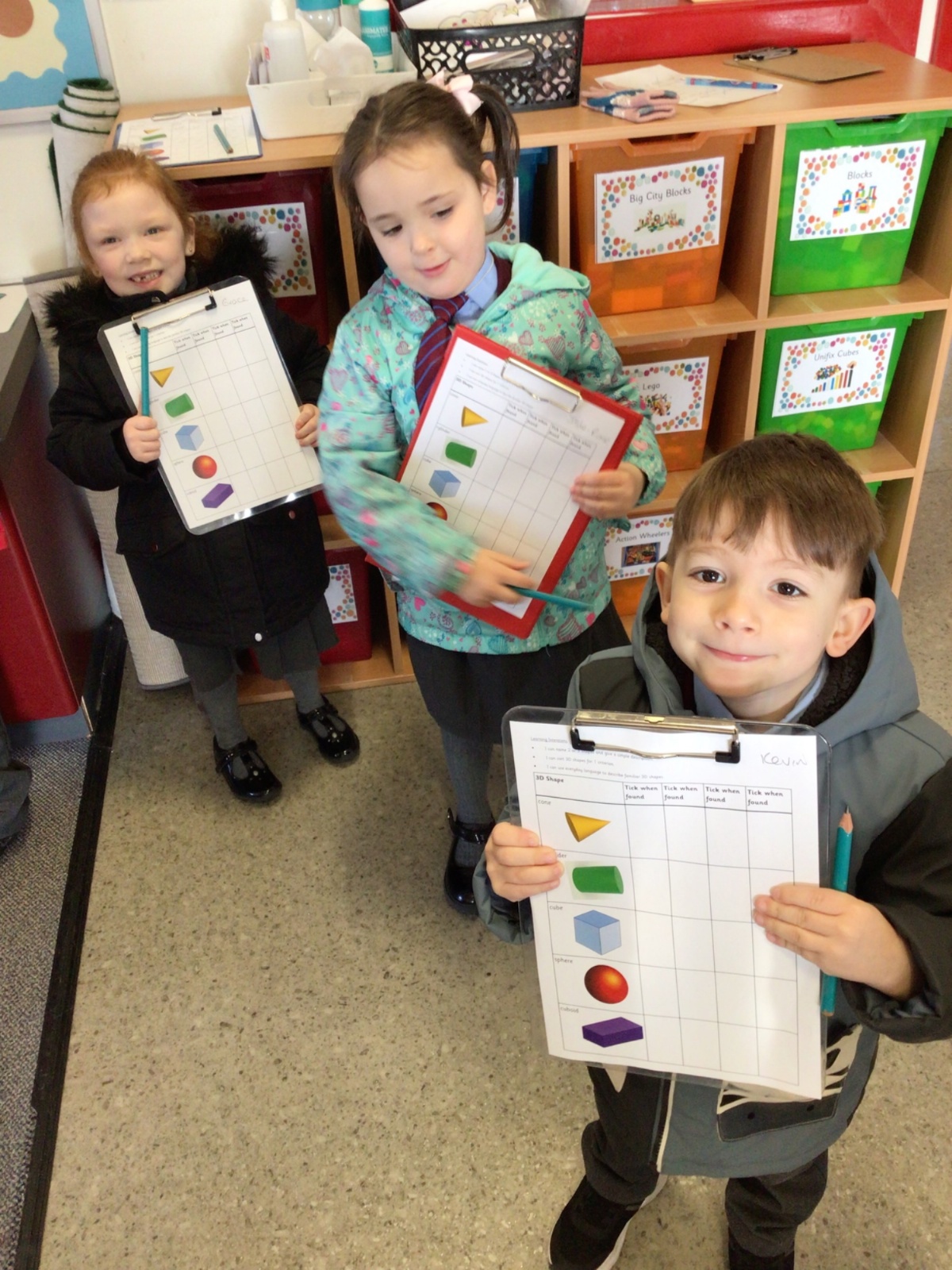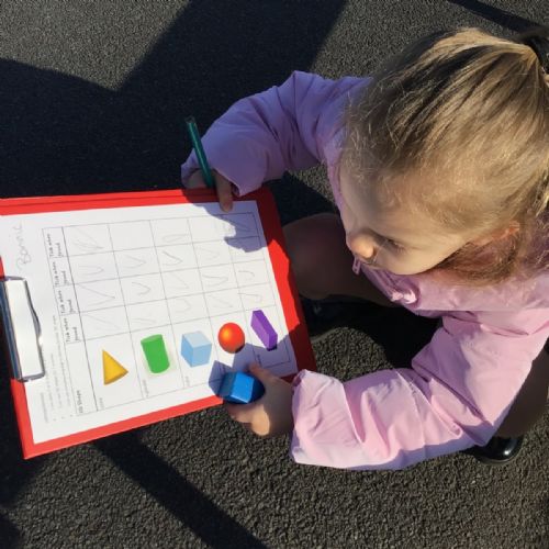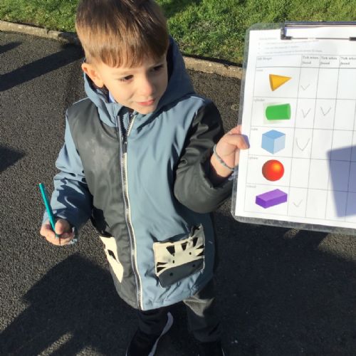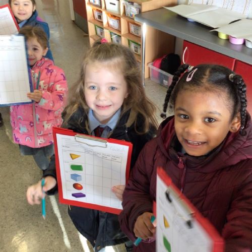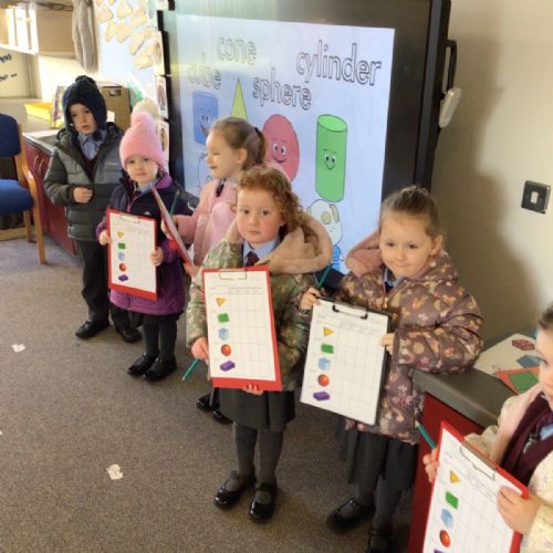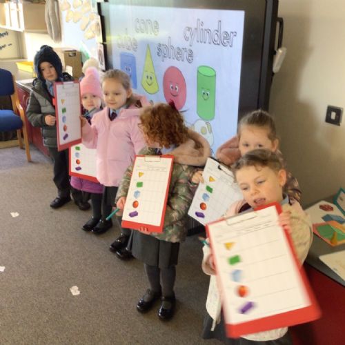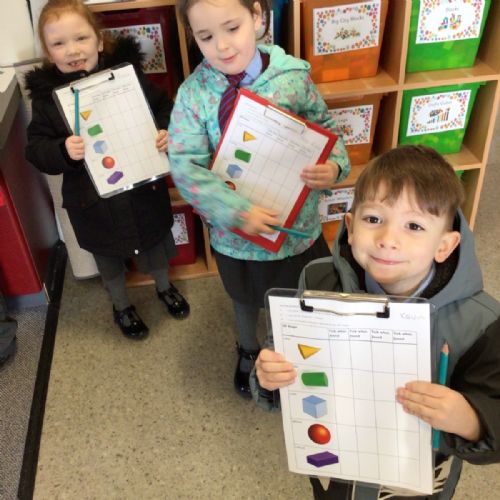 The children in Year 1 are learning about the 3D shapes cylinder, cone, cube, cuboid and sphere. Today they went in search of the shapes and built a city using the 3D shapes they found.