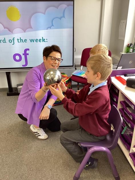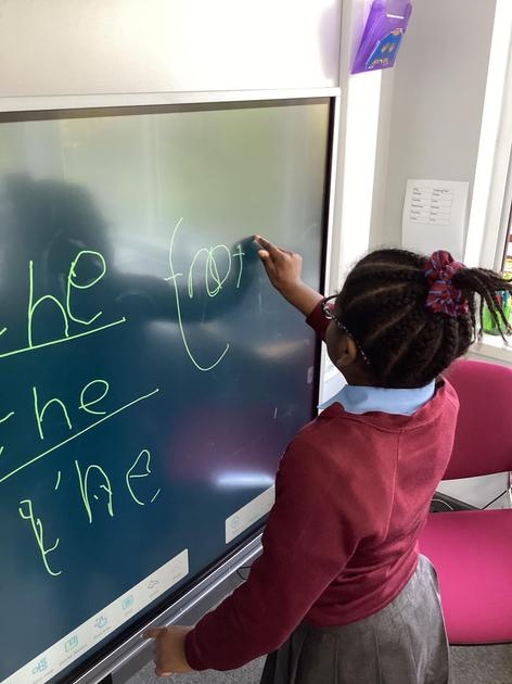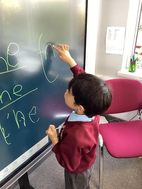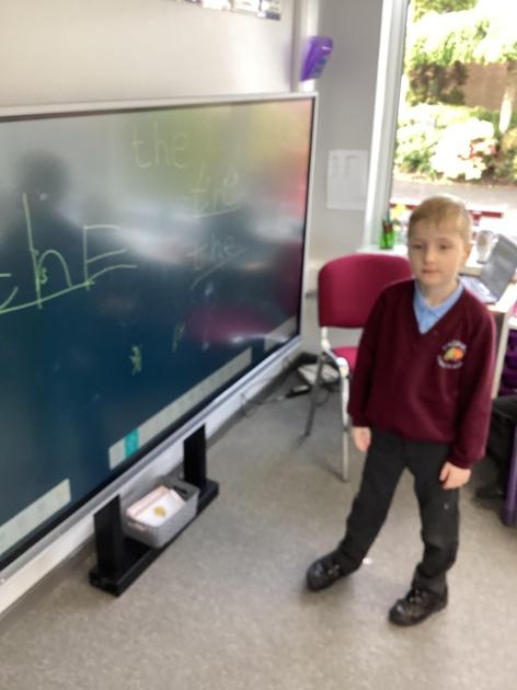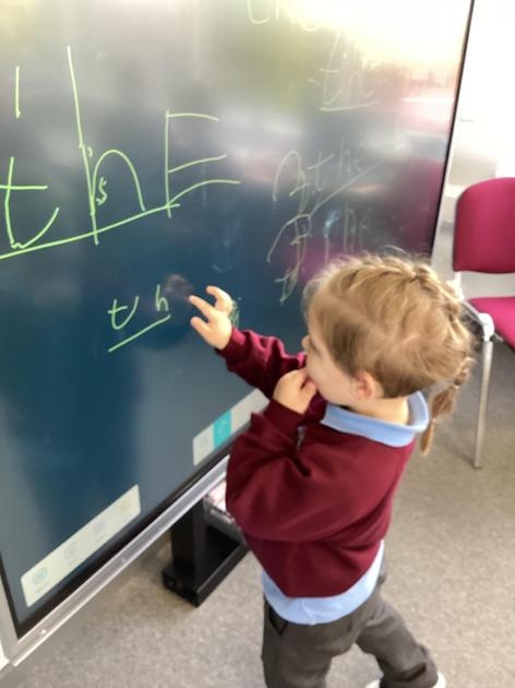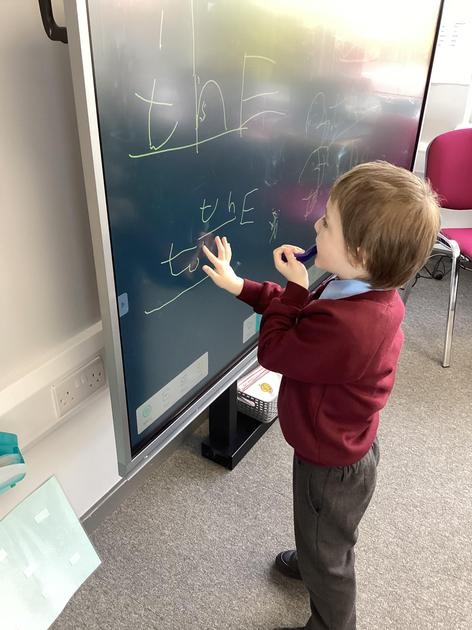 Our word of the week is “the”. Here we are writing the word on our whiteboard. Brilliant work!