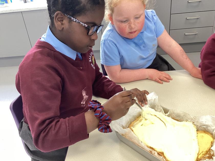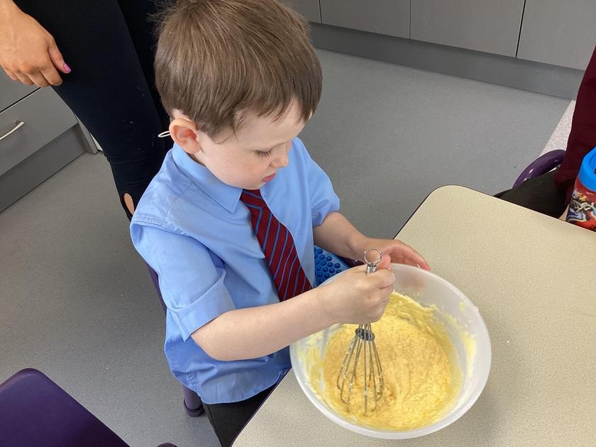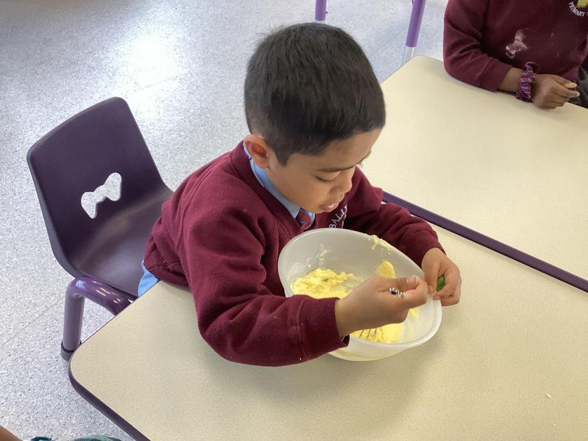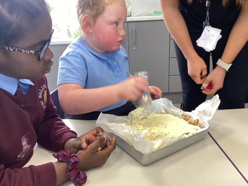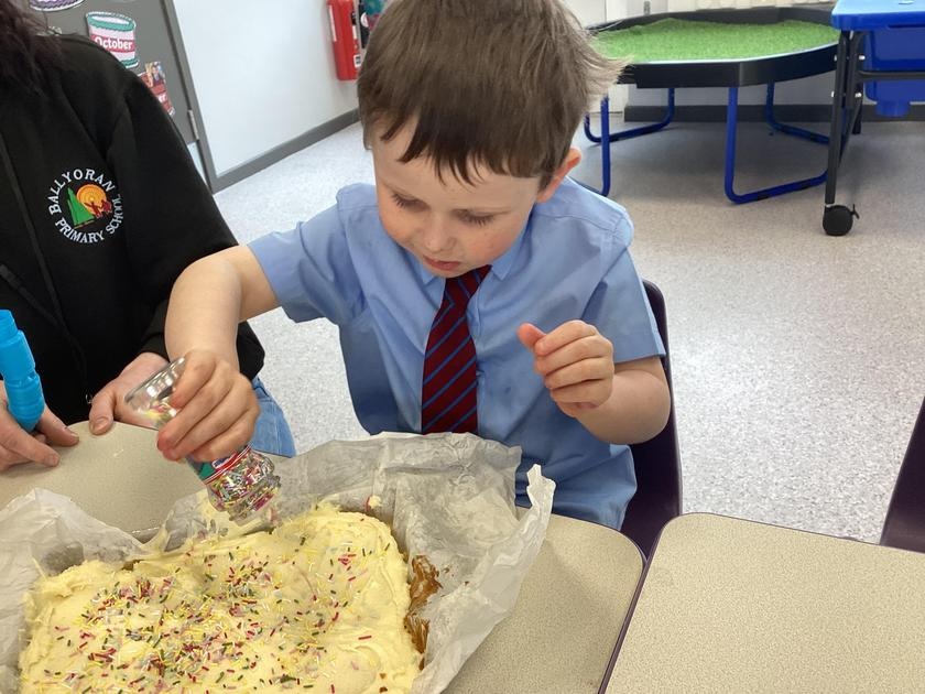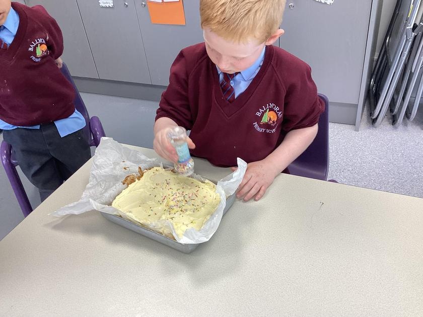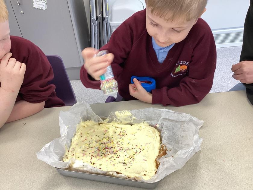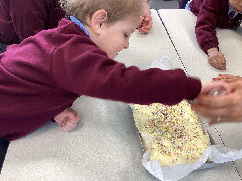 In cookery today we baked a lovely sponge cake with sprinkles. We enjoyed mixing the ingredients together and icing the top. The best part was tasting it - delicious!