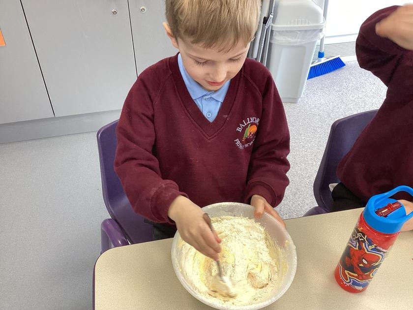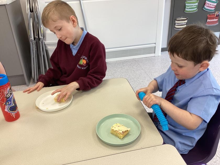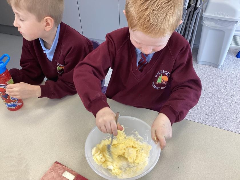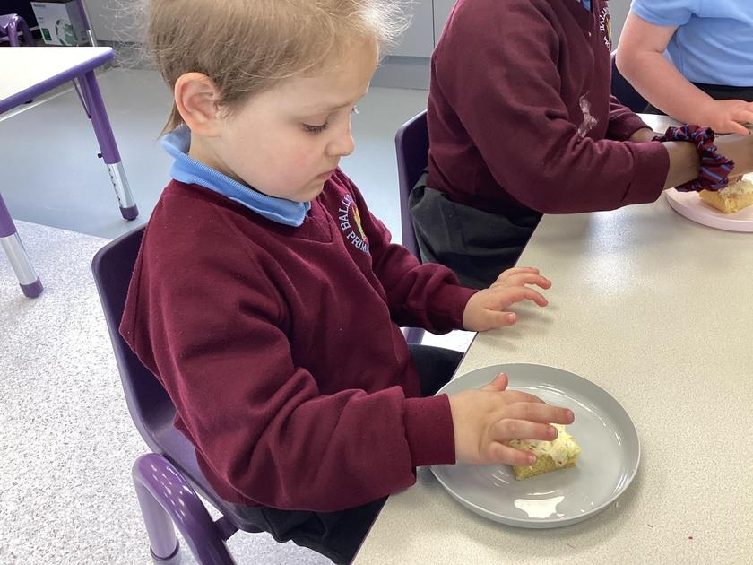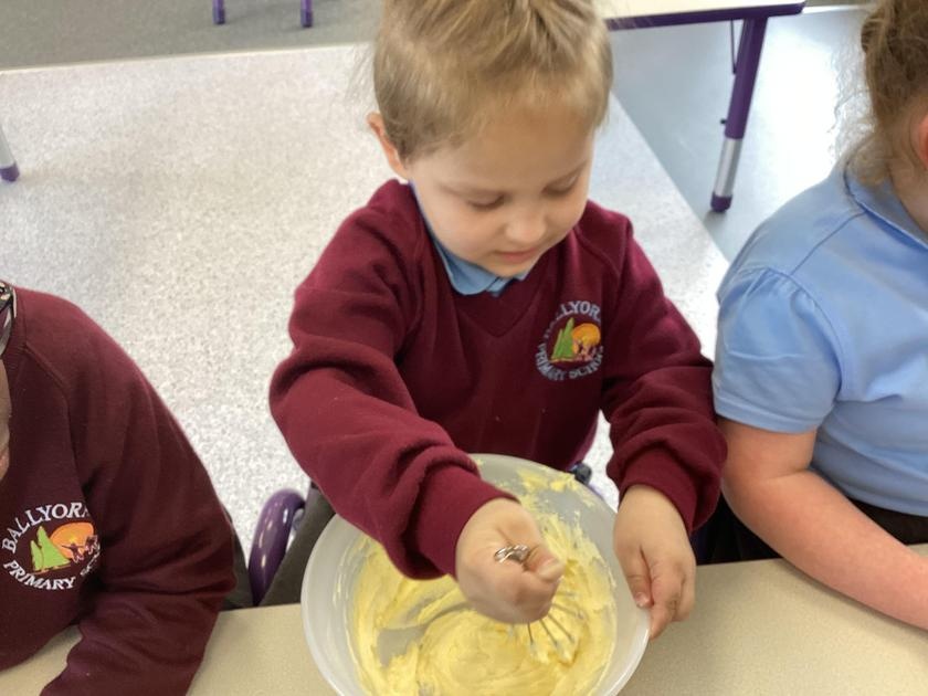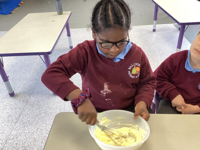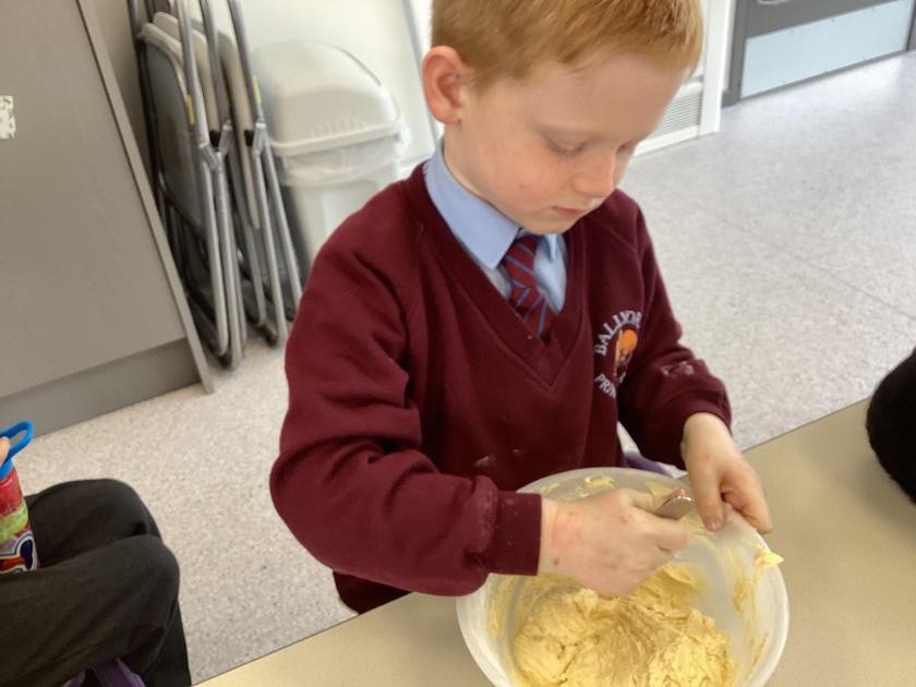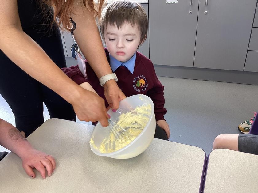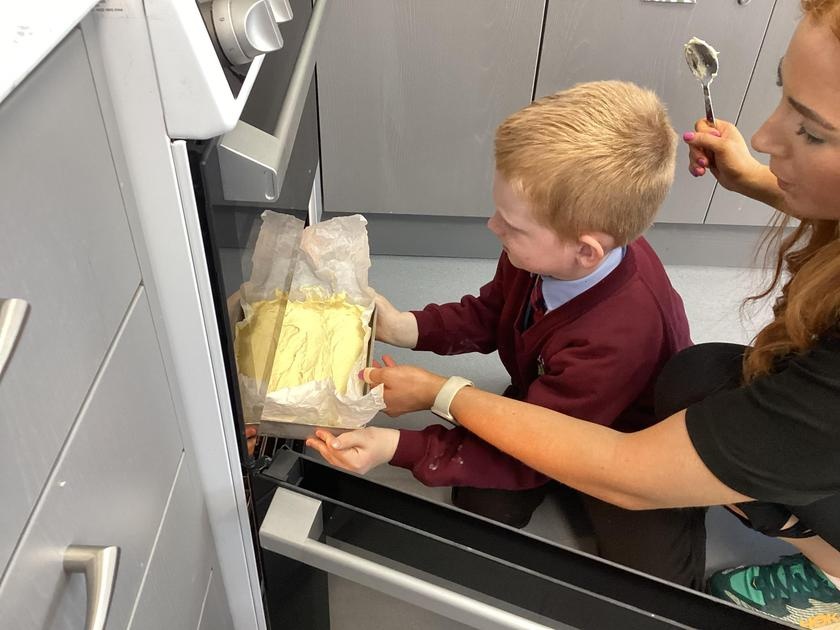 In cookery today we baked a lovely sponge cake with sprinkles. We enjoyed mixing the ingredients together and icing the top. The best part was tasting it - delicious!