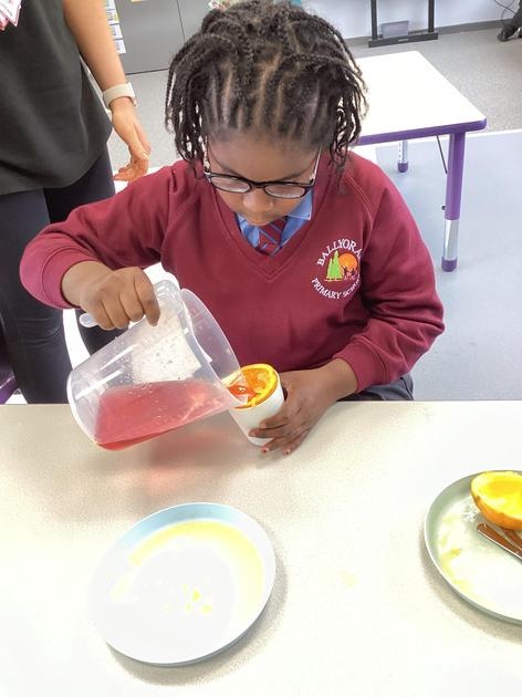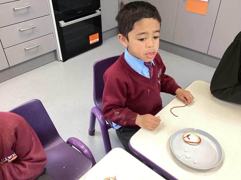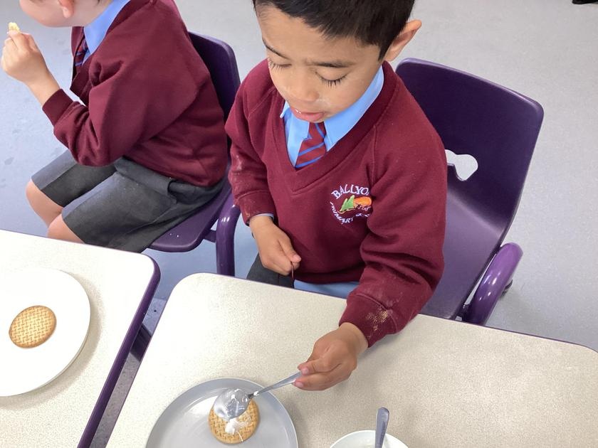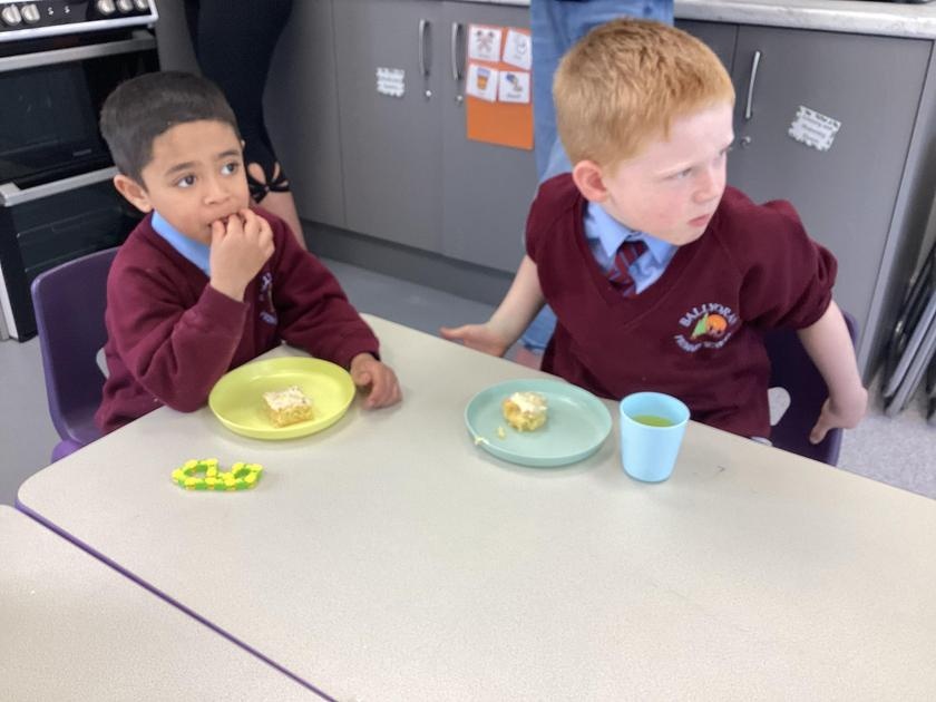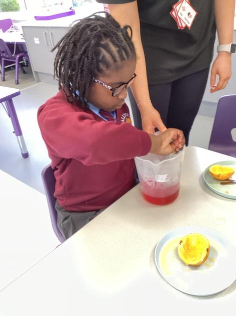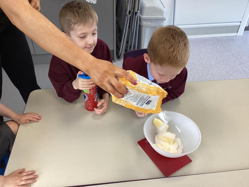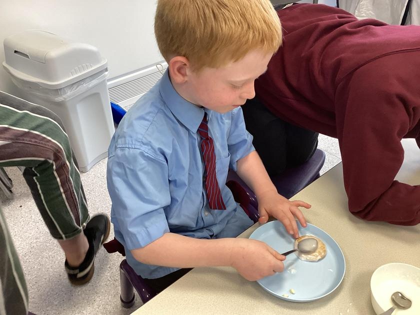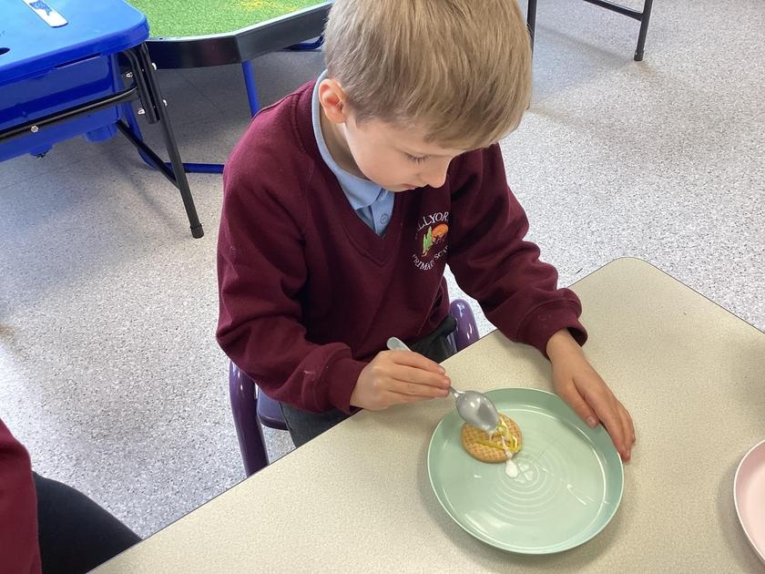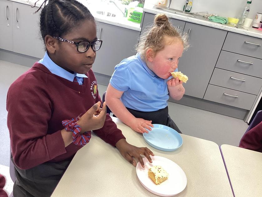 In cookery today we baked a lovely sponge cake with sprinkles. We enjoyed mixing the ingredients together and icing the top. The best part was tasting it - delicious!