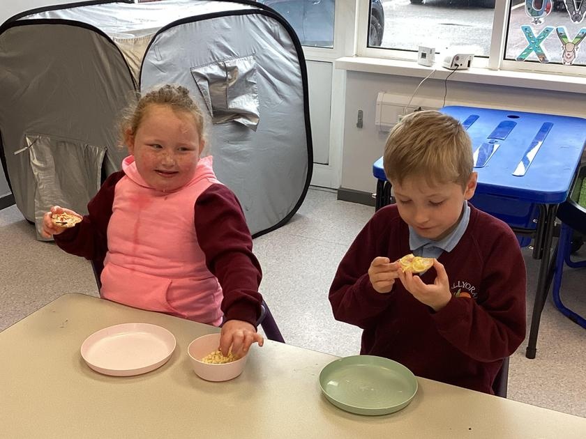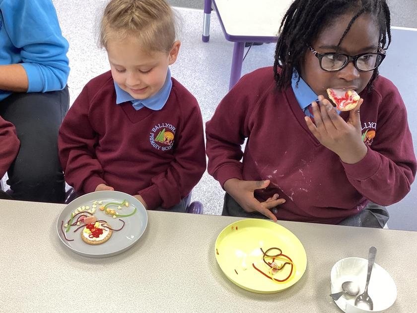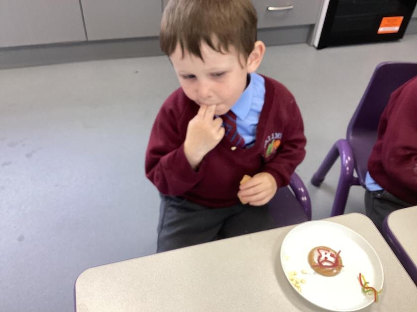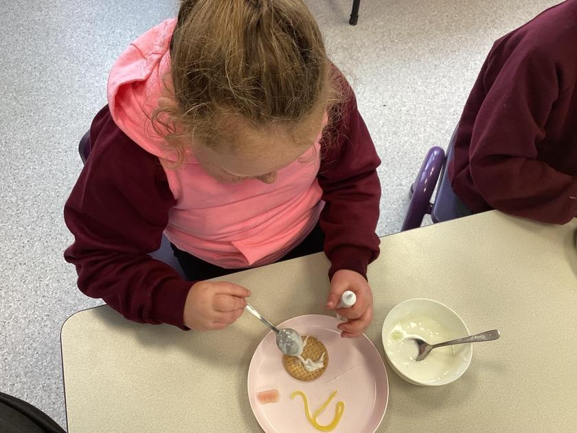 We enjoyed making funny face iced biscuits. We iced the biscuits and decorated them with different sweets. They tasted great!